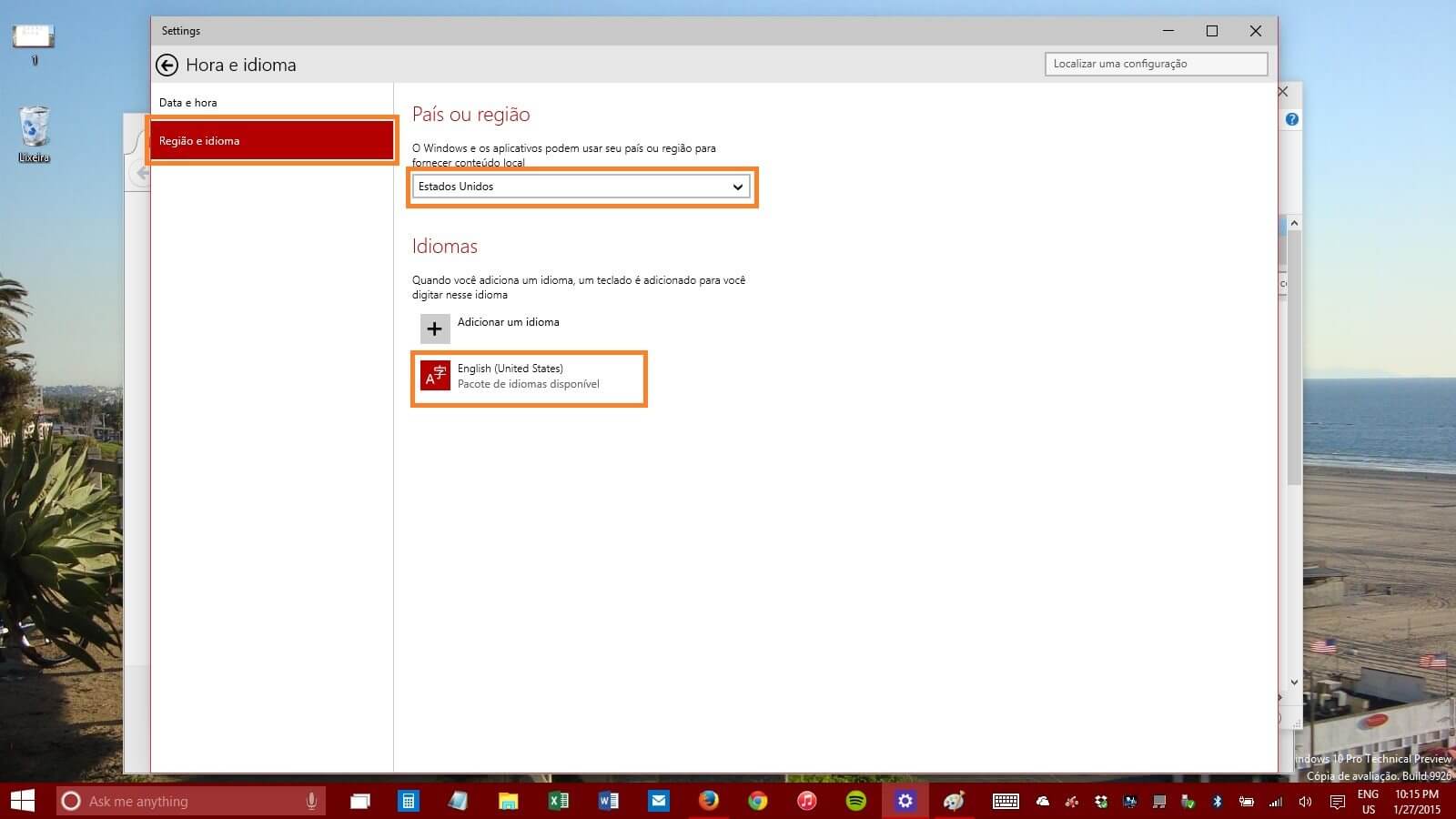 4) Logo abaixo, clique em Adicionar um Idioma e selecione English (Inglês – Estados Unidos);