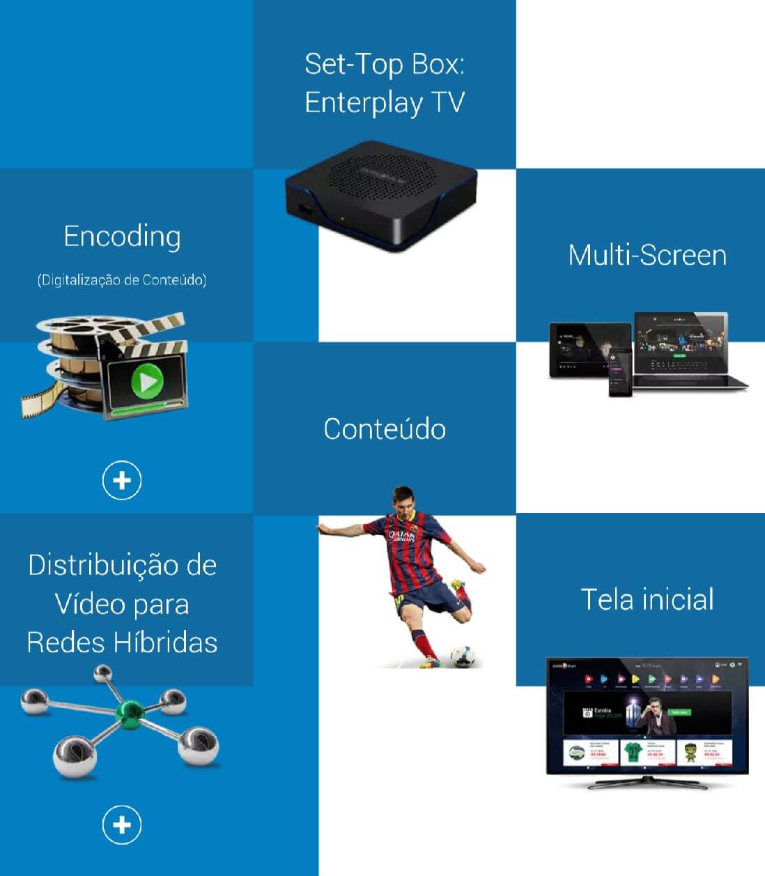 Um dos componentes principais da plataforma é um set-top-box, batizado de EnterPlay TV, que funciona como um conversor digital, ponto de acesso Wi-Fi e permite, por meio de qualquer televisor, acessar a plataforma EnterPlay para assistir filmes, séries, aplicativos (Facebook, Skype, e-mail etc.), jogos, navegar na internet, entre outras funcionalidades.