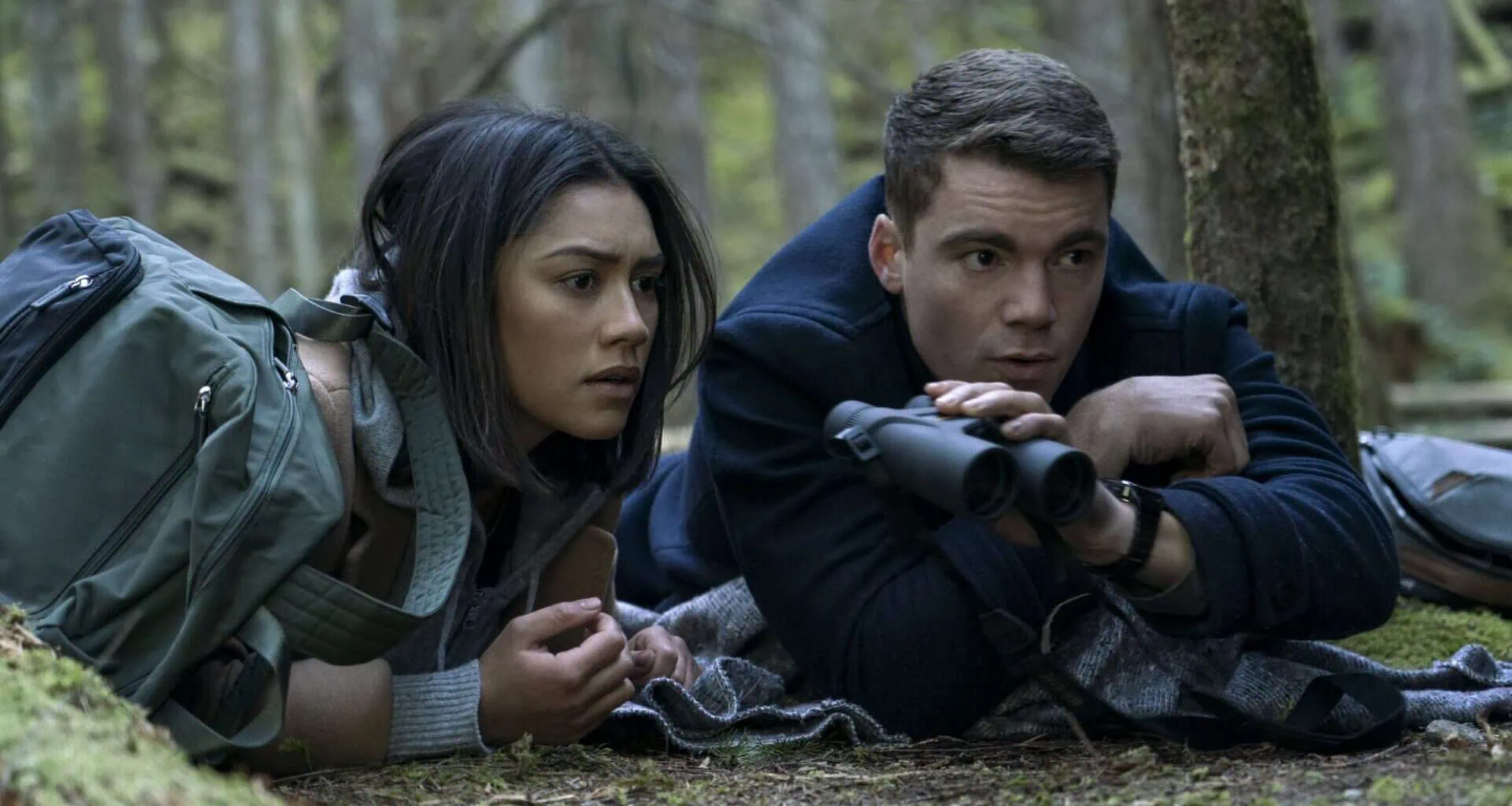 Imagem de dois jovens observando pelo binóculo na floresta.