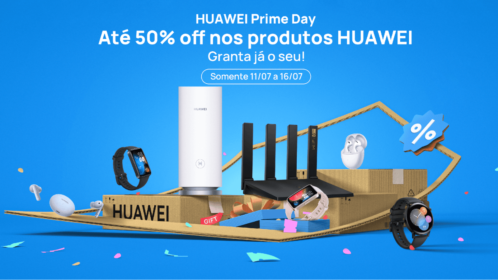 Prepare-se para o HUAWEI Prime Day e aproveite os valores especiais em alguns dos dispositivos mais populares da marca! Quer você esteja procurando um smartwatch para atividades físicas, fones de ouvido sem fio ou roteadores Wi-Fi, temos opções com tecnologia de ponta e designs elegantes para mantê-lo conectado e entretido em qualquer lugar. A promoção vai até o dia 16 de julho e você terá a oportunidade de aproveitar descontos incríveis de até 50%. Não deixe passar essa chance única de atualizar seus dispositivos com a qualidade e inovação que somente a Huawei pode oferecer. Confira os aparelhos com desconto!