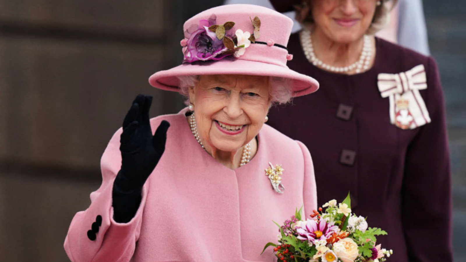 A rainha assistiu à pompa da sacada do Palácio de Buckingham e foi acompanhada por quatro gerações de seus herdeiros, incluindo seu filho mais velho, o príncipe Charles; assim como o filho mais velho de Charles, o príncipe William; e o filho mais velho de William, o príncipe George. Apesar da idade e de ter sofrido um caso de COVID-19 em fevereiro, a rainha, com pérolas e vestido azul-claro, casaco e chapéu, exibia um largo sorriso.