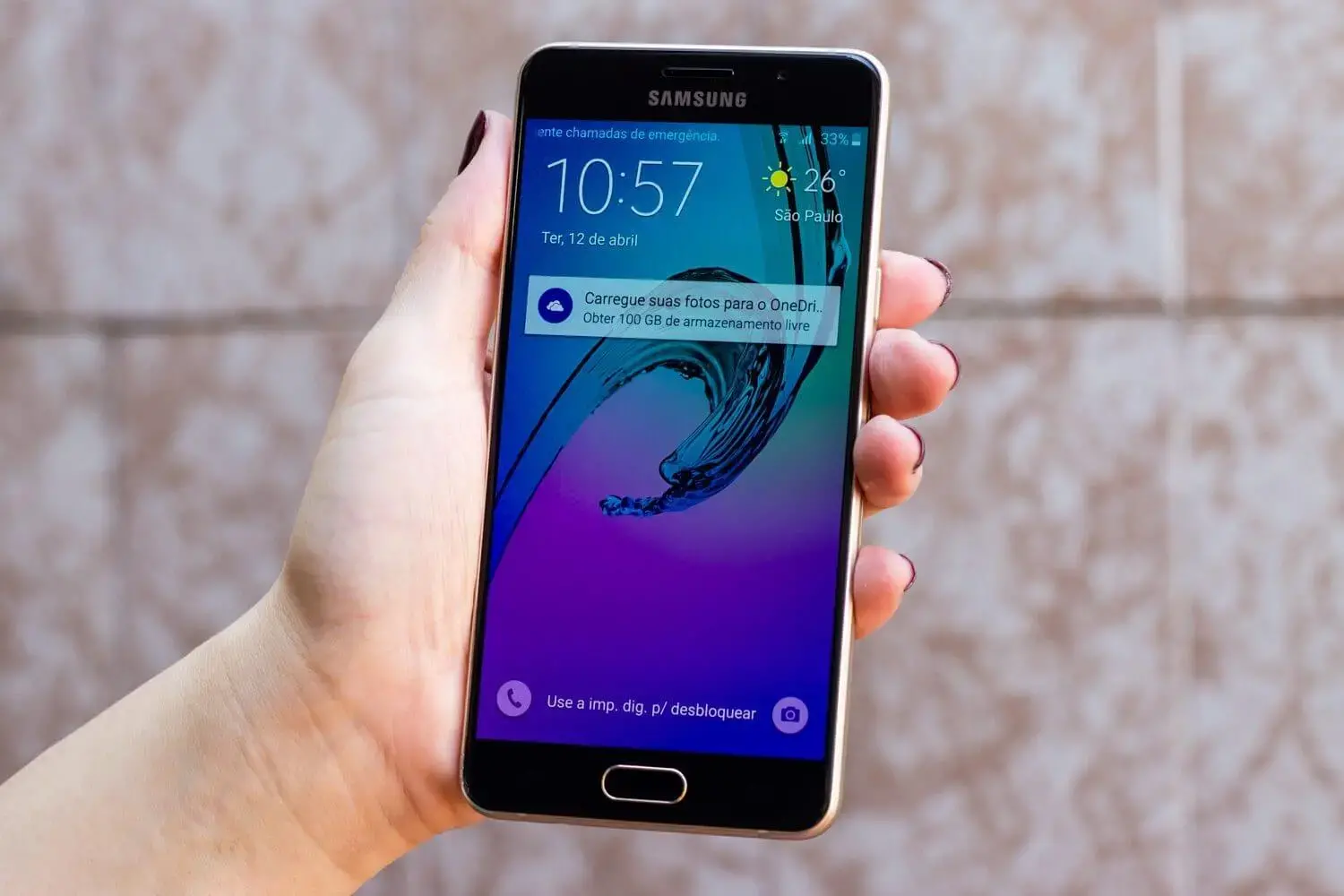 Ele conta também com o sensor de impressão digital, embutido no botão principal. Ao ativar o sensor, é possível desbloquear a tela e autorizar pagamentos no serviço Samsung Pay ou usar a biometria em aplicativos que ofereçam esse tipo de suporte. O sensor não se mostrou tão veloz e consistente quanto nos modelos mais sofisticados da Samsung e por muitas vezes eu precisei repetir as tentativas de desbloqueio.