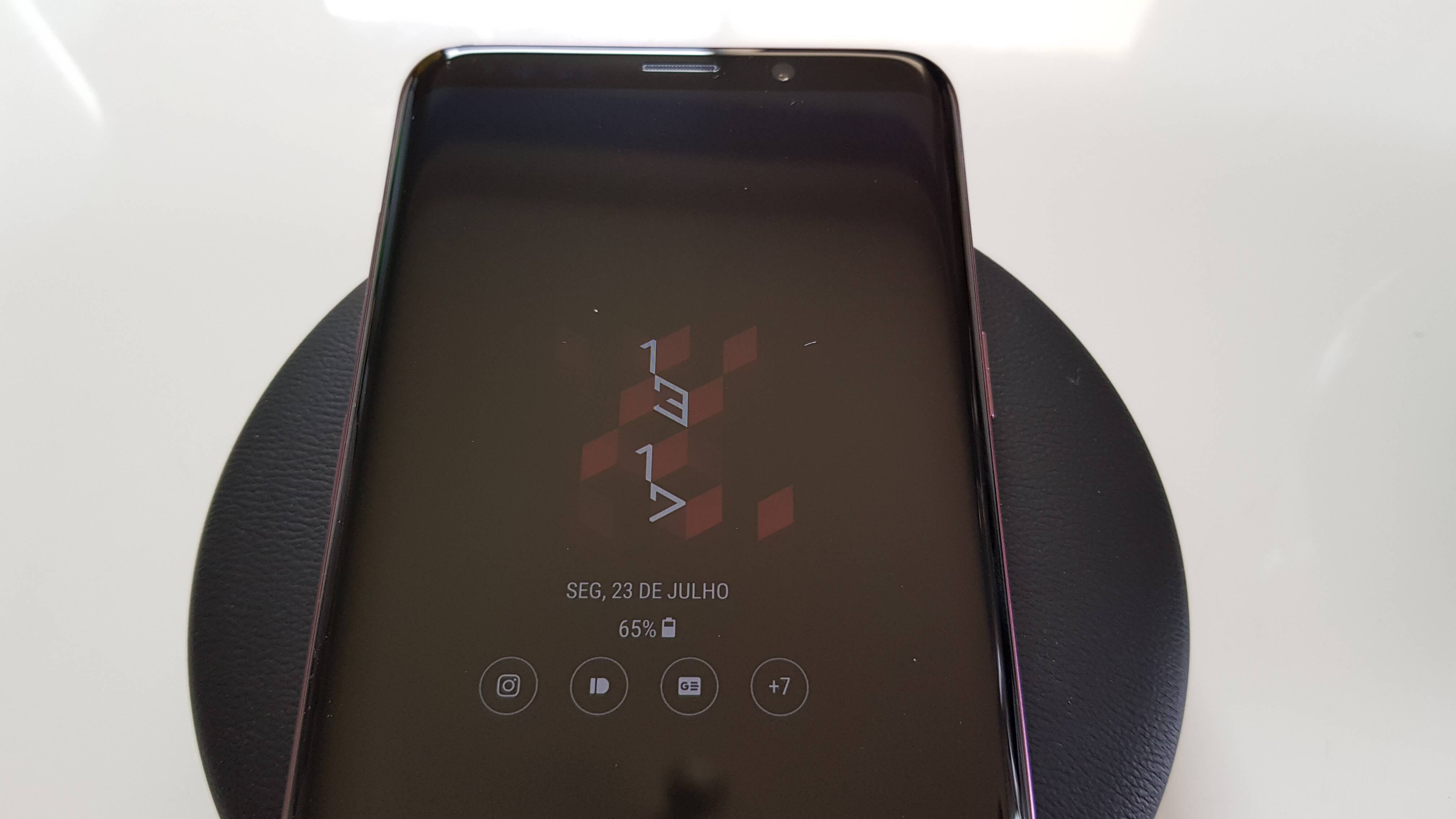 O Galaxy S9 tem display de 5,8 polegadas Quad HD+ curvo, com tecnologia Super AMOLED e formato 18:5:9;